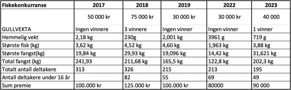 Fiskekonkurransen i Sørli ble for første gang arrangert i 2017. Grunnet korona-situasjonen har vi ikke gjennomført en normal fiskekonkurranse hverken i 2020 eller 2021. Men nedenfor har vi satt sammen litt artig statistikk og utvikling fra oppstart.